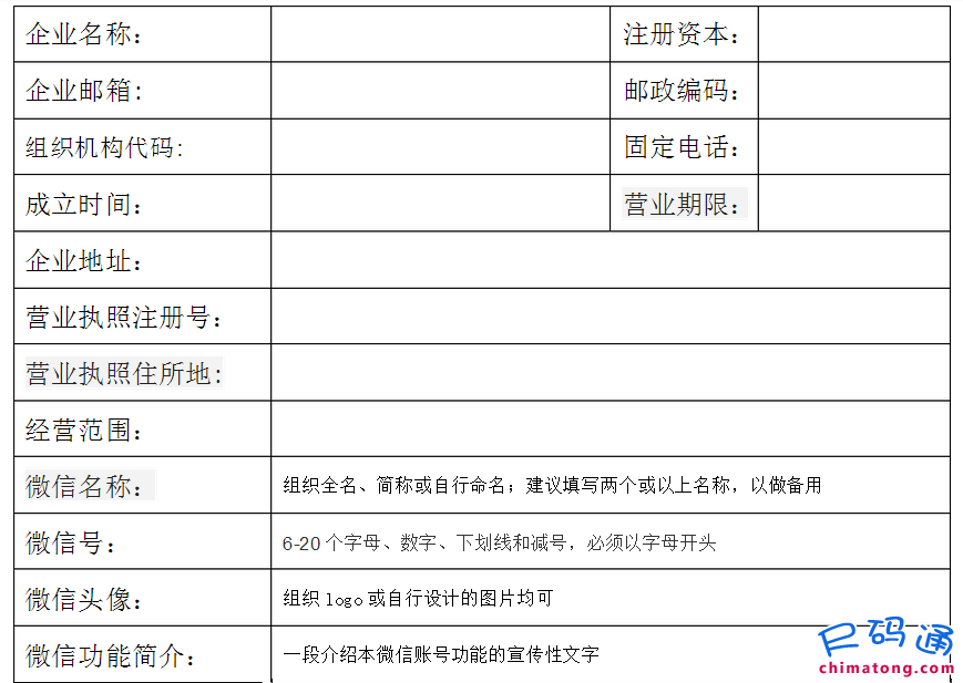 一、企業(yè)微信公眾賬號(hào)申請(qǐng)所需資料表