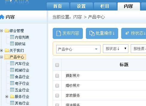 首先選擇【內(nèi)容】欄,找到【產(chǎn)品中心】選擇要發(fā)布到的分類,點擊【發(fā)布內(nèi)容】