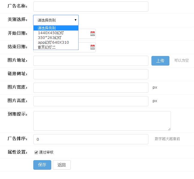 找到【擴(kuò)展】,選擇【廣告管理】,點擊【添加圖片廣告】。首先填寫【廣告名稱】,其次選擇好【類別選擇】,之后上傳【圖片地址】,填寫好【鏈接網(wǎng)址】,定義好【圖片寬度】、【圖片高度】,最后點【保存】就可以