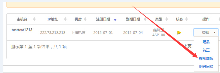 點(diǎn)擊對(duì)應(yīng)虛擬主機(jī)名稱的“管理”;,在下拉菜單中點(diǎn)擊“控制面板”進(jìn)入相應(yīng)的管理頁(yè)面。