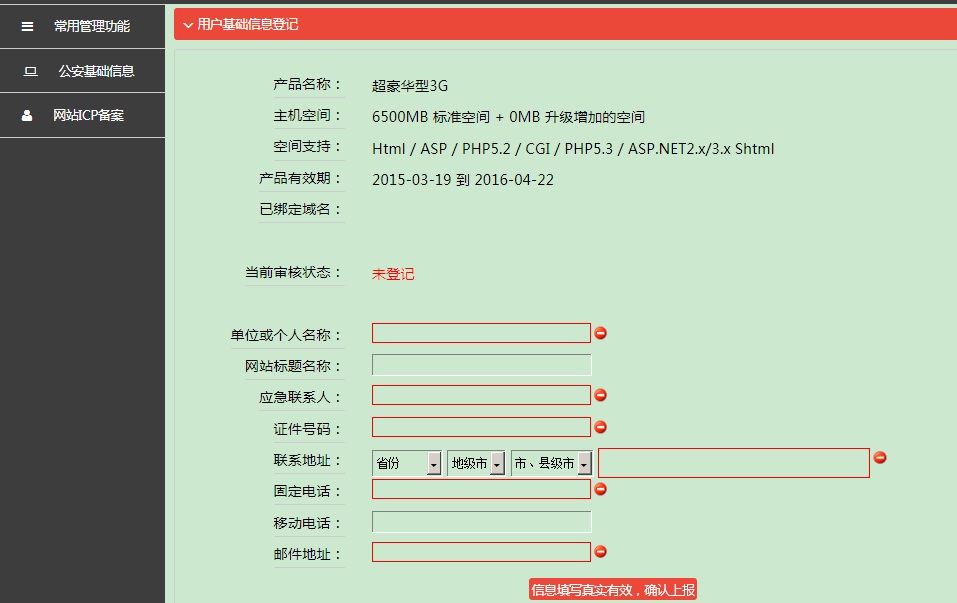 國(guó)外空間,域名不需要備案,直接在“網(wǎng)站域名綁定”中綁定對(duì)應(yīng)域名即可。如果是國(guó)內(nèi)空間,域名先要備案成功后才能綁定使用,如果網(wǎng)站沒(méi)有填寫公安基礎(chǔ)信息,綁定時(shí)會(huì)有提示,要求先填寫相應(yīng)的信息,如下圖: